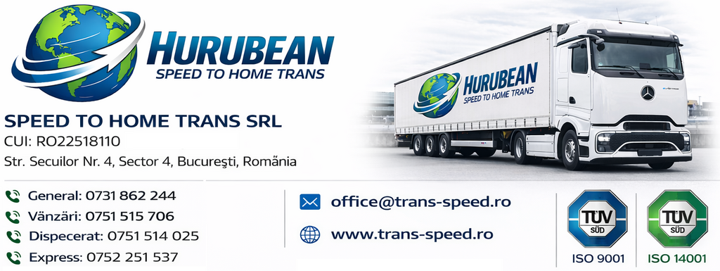 HURUBEAN SPEED TO HOME TRANS SRL activeaza pe piata transporturilor de marfuri inca din anul 2007 cu un parc propriu de masini, casa de expeditii, si service de autocamioane. Dispunem parc propriu de mașini cu asigurare CMR / GLOBALA de 1000.000 EURO dar și departament de expediții cu coordonatori de transport care pot comunica cu clienții dvs. externi în limba de origine. Atat ca transportator, cat si ca expeditor, va asiguram de cea mai buna satisfacere a cerintelor dvs., necesitatile si exigentele clientilor fiind prioritatea noastra. Firma noastra are o echipa competenta, flexibila si dinamica, permanent in contact cu partenerii sai,gata oricand in a va rezolva necesitatile de transport. Alegand SPEED TO HOME TRANS SRL dispuneti de interlocutori responsabili care, datorita pregatirii si experientei acumulate, va pot da toate raspunsurile necesare pentru a organiza un transport sau a aplica o strategie de transport in tarile UE si CSI. Firma noastra este specializata in transportul rutier de marfa, bazandu-se pe o retea extinsa de colaboratori interni si internationali. Situarea noastra geografica privilegiata ne este de folos in organizarea transporturilor atat catre tarile Uniunii Europene, cat si catre tarile CSI. Va punem la dispozitie urmatoarele tipuri de camioane pentru destinatiile de mai jos: Camioane cu prelata, dube, jumbo, megatrailer, frigorifice, cu sarcina utila 20-24 tone si inaltime de pana la 3 metri, cu sarcina utila de 3,5 tone si 7,20 metri. Traficul este coordonat de profesionisti care analizeaza solicitarile si ofera solutii personalizate pentru fiecare client in parte. Transport rutier auto de marfa la grupaj Ce este transportul de marfa in regim de grupaj ? Daca aveti de efectuat transporturi internationale de marfa (generala sau ADR) in partide de marfa mai mici decat un camion complet, va punem la dispozitie serviciile noastre de transport marfa international in regim de grupaj. Ce rute deservim la transportul in grupaj ? Rutele pentru care se efectueaza grupaj de marfuri sunt foarte diverse: la import catre Romania din Europa si / sau spatiul extracomunitar, iar la export din Romania catre intreaga Europa si / sau spatiul extracomunitar Nota: in anumite tari din spatiul extra-comunitar precum : Serbia, Croatia, Bosnia, Rusia, Ucraina, Azerbaidjan, Iran, Kazahstan, Turkmenistan, nu avem posibilitatea de a organiza grupaje de marfa. Pentru mai multe detalii despre tarile rutele pentru care putem oferi serviciul de grupaj, ne puteti adresa intrebarile Dvs. la adresa de e-mail: [email protected] De regula, pentru eficenta si rapiditate, optam in a oferi clientilor nostri servicii de grupaj direct pe camioane. Avantajele acestui tip de grupaj fata de grupajul clasic in centre logistice, constau in: termeni mai redusi de livrare; numar de manipulari ( incarcari/descarcari) mai redus; eficenta costurilor. Nu intotdeuna vom avea posibilitati de a oferi grupaj direct pe camion; in acest caz grupajul clasic prin centre logistice fiind un serviciu alternativ pe care il putem oferi clientilor nostri. Spre deosebire de transportul complet, transportul la grupaj ofera clientilor nostri posibilitatea de a transporta si partide mai mici de marfa. In ce zone geografice putem oferi servicii de transport la grupaj ? Putem oferi tarife competitive de transport marfa atat pentru export cat si pentru import in si din tari precum Portugalia, Spania, Franta, Anglia, Belgia, Olanda, Germania, Danemarca, Suedia, Norvegia, Finlanda, Lituania, Letonia, Estonia, Italia, Elvetia, Austria, Cehia, Slovacia, Polonia, Ungaria, Bulgaria, Slovenia, Croatia, Serbia, Turcia. Transporturile se executa in baza conventiilor internationale CMR / TIR Putem oferi, in limita camioanelor disponibile in zonele de incarcare, tarife de transport marfa competitive pe rute si destinatii din si catre toate judetele Romaniei: Alba, Arad, Arges, Bacau, Bihor, Bistrita-Nasaud, Botosani, Braila, Brasov, Bucuresti, Buzau, Calarasi, Caras-Severin, Cluj, Constanta, Covasna, Dambovita, Dolj, Galati, Giurgiu, Gorj, Harghita, Hunedoara, Ialomita, Iasi, Ilfov, Maramures, Mehedinti, Mures, Neamt, Olt, Prahova, Salaj, Satu-Mare, Sibiu, Suceava, Teleorman, Timis, Tulcea, Valcea, Vaslui, Vrancea. Transport frigorific Atunci cand marfa pe care doriti sa o transportati este perisabila, SPEED TO HOME TRANS SRL va pune la dispozitie servicii de transport frigorific - cu temperatura controlata, cu temperaturi asigurate intre -20 si + 25 grade - in modul cel mai uzual caz. Transportul frigorific congelat si refrigerat este divizat in doua categorii: Transport frigorific cu congelare - atunci cand se transporta bunuri congelate ( peste congelat, carne congelata,produse patiserie, etc ) la temperaturi uzuale de -18/-20 grade Celsius Transport frigorific cu refrigerare - atunci cand se transporta bunuri care necesita doar racire si pastrarea unei temperaturi constante pe intreaga durata a transferului ( peste proaspat, carne proaspata, carcase de animale, legume, fructe, etc).- temperatura este similara cu cea din frigiderul de acasa :) 0...4 grade. Toate transporturile frigorifice se asigura cu dube frig de diverse capacitati de la 1,5 tone la 22 tone dotate cu agregate de conditionare a aerului si diagrame de temperatura. Produsele ce necesită temperatura controlata prezinta un grad crescut de perisabilitate, motiv pentru care asiguram transport cu mijloace auto frigorifice sau Thermoking, dotate cu agregate de temperatura controlata, in conditii de maxima siguranta si curatenie.La cerere, pentru produse perisabile, organizam transporturi urgente prin mijloace de transport cu un echipaj format din 2 soferi.Astfel oferim un timp de tranzit extrem de mic . Detineti controlul permanent asupra locatiei marfii pe durata transportului , toate camioanele fiind echipate cu sistem de urmarire prin GPS . Marfa transportata este asigurata CMR. Transport naval Oferim servicii de transport pentru orice destinatie atat pentru export cat 